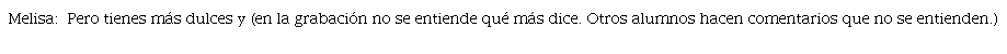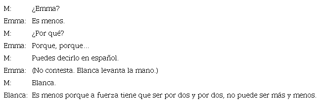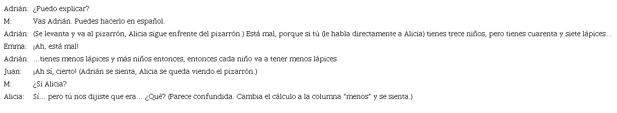 Para calmar la situación la docente realiza una intervención en la cual solicita a Adrián que repita su explicación. Esta intervención se apoya en el supuesto de que, para algunos alumnos, escuchar la explicación contextualizada por parte de su compañero les permitirá entender las relaciones en juego: