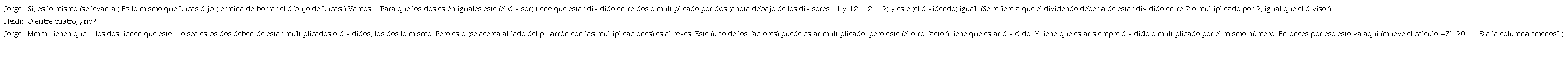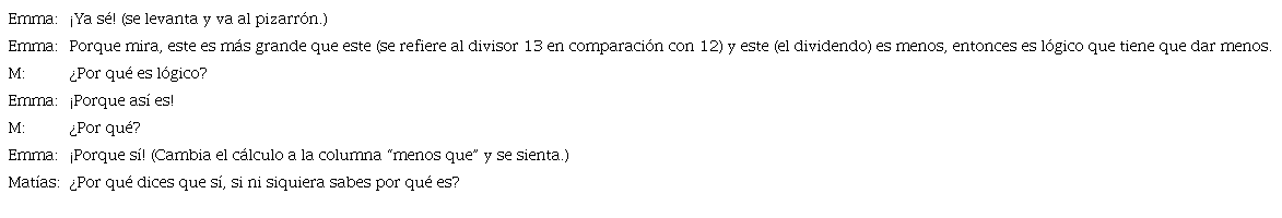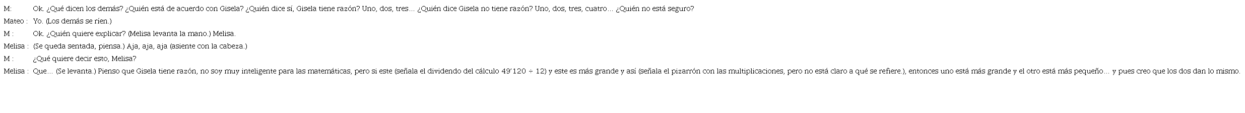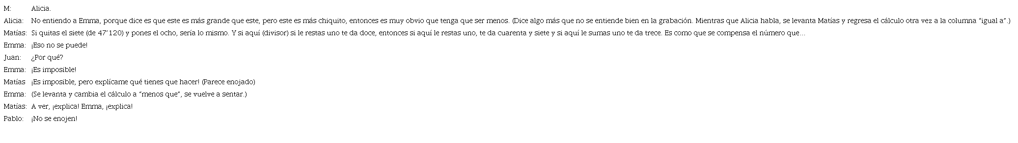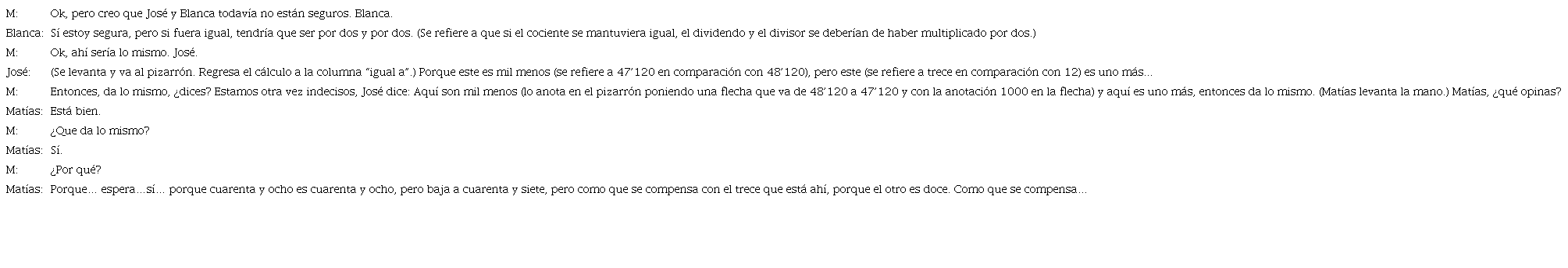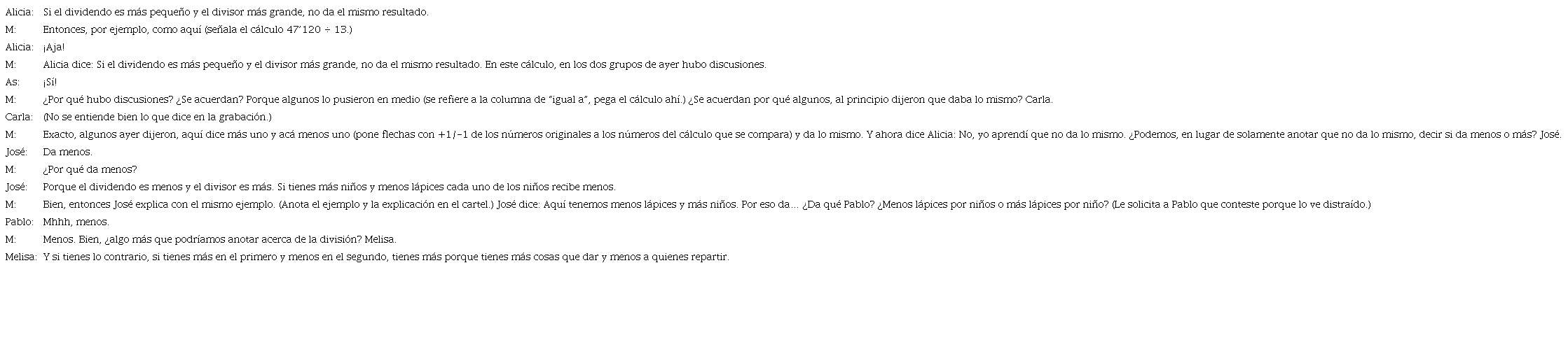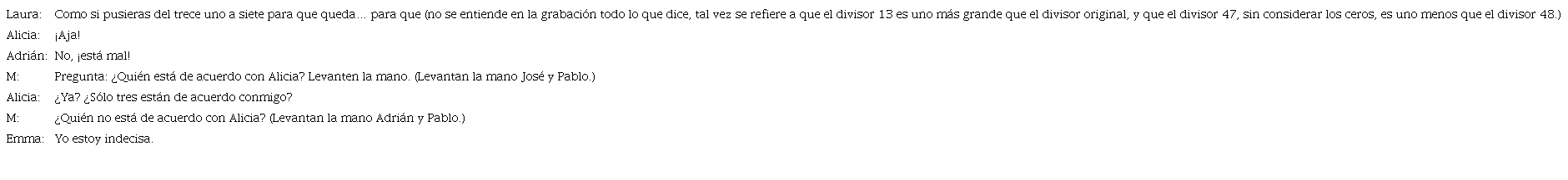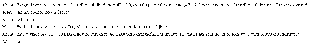 Aunque confunde los términos matemáticos “divisor” y “factor”, Alicia expresa la misma idea de compensación que Melisa dio en el grupo anterior. Su explicación no es clara y queda inconclusa; sin embargo, sus compañeros expresan haberla comprendido. Laura complementa la explicación de Alicia, apoyando la idea de la compensación, mientras que algunos otros alumnos manifiestan su desacuerdo: