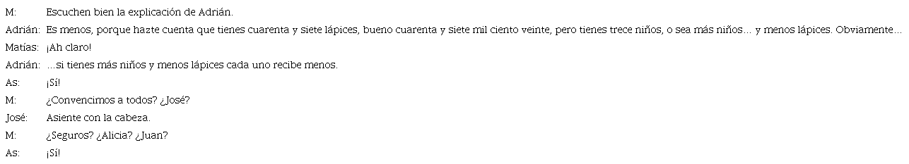 Como lo hizo Lucas en el grupo anterior, Adrián se apoya en un contexto de reparto (lápices entre niños) para justificar su respuesta. Alicia, aunque expresa su acuerdo con la explicación de Adrián, parece confundida. La maestra sostiene la incertidumbre y la devolución frente a la convicción de que podría haber otros alumnos que no estuvieran de todo convencidos de la respuesta.