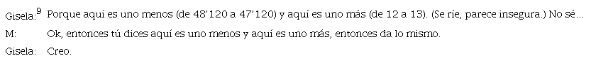 En lo que expresa Gisela, “porque aquí es uno menos y aquí es uno más” se manifiesta la idea de compensación; sin embargo, Gisela exterioriza cierta inseguridad. La docente devuelve el problema al grupo, lo que se puede observar a continuación: