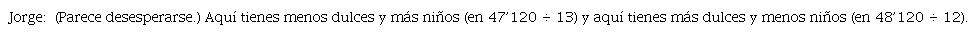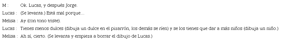 Lucas expresa su desacuerdo con lo dicho por Gisela y Melisa y argumenta apoyándose en un contexto de reparto para justificar su opinión. Aparentemente la explicación de Lucas le parece lógica a Melisa. Enseguida Jorge apoya a Lucas y da una explicación sin recurrir a ese contexto:
