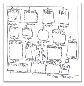 Miguel produjo una lista icónica como representación de los datos, la cual contiene íconos, textos y dígitos (ver Anexo 2). La lista posee íconos que indican la categorización de las colaciones, según la variable “tipo de colación”; y los textos bajo cada ícono dan cuenta de la categorización, según la variable “calidad nutricional de la colación” (Figura 5). En un episodio ocurrido durante la lección, mientras Miguel terminaba de construir su lista, uno de los investigadores le pregunta respecto a su representación.