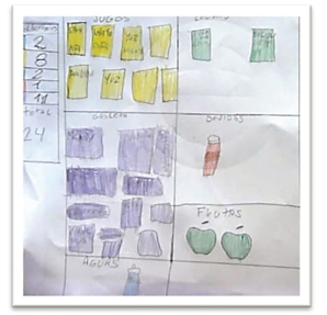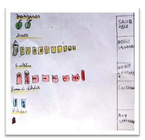 Problema de la lección. Los estudiantes enfrentaron una situación de análisis exploratorio con datos reales. El problema proponía la siguiente tarea ¿de qué manera podemos organizar nuestras colaciones para saber si son saludables? La foto-grafía fue entregada en una hoja de trabajo a cada estudiante, la cual también contempló espacios en blanco para que los estudiantes pudieran construir una representación de los datos y así pudieran responder al problema (Figura 4).