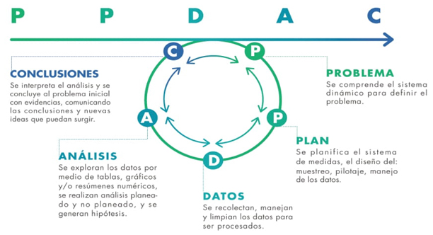 El ciclo investigativo (PPDAC) “describe los procedimientos a través de los cuales un estadístico trabaja y lo que el estadístico piensa para aprender más en la esfera del contexto.” (Pfannkuch y Wild, 2004, p. 41). Este ciclo se ocupa de abstraer un problema estadístico y permite explorar las posibles soluciones, provocando cambios en un sistema para mejorar algo, lo cual requiere una mejor comprensión de su dinámica, en tanto a cómo funciona, anticiparse a cómo reaccionará ante los cambios en los flujos de entrada, su configuración y el contexto (MacKay y Oldford, 2000). Por lo tanto, el ciclo investigativo contribuye al aprendizaje desde los datos (Wild et al., 2018).