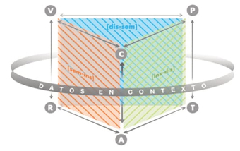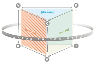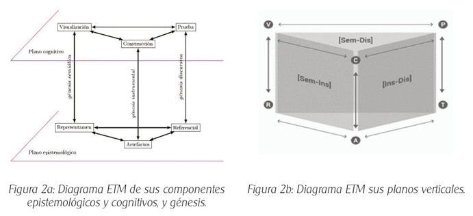 Este modelo permite examinar y comprender la construcción del significado personal o institucional referido a un objeto matemático de manera pragmática, en la resolución de actividades por el estudiante o de manera hipotética en la propuesta de tareas por el docente o el currículo, considerándose la perspectiva epistemológica y cognitiva propias de la matemática, cuyas conexiones se asignaron en el diagrama ETM de la Figura 2a, con la denominación de génesis semiótica, instrumental y discursiva. Además, cada dos génesis coordinadas se constituyen planos verticales como se exhibe en el diagrama ETM de la Figura 2b, cuyas representaciones se establecen como [Sem-Ins], [Ins-Dis] y [Dis-Sem].