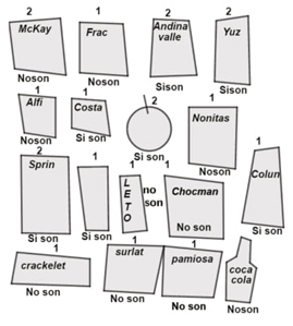 Para Miguel el dígito sobre cada ícono indica la cantidad de datos que dicha categoría contiene y el texto bajo los íconos refiere a una segunda clasificación, en la que cada tipo de colación fue categorizada como no son saludables (representado como “noson”) y, sí son saludables (representado como “sison”). Sin embargo, su clasificación no es exhaustiva porque representó 22 de las 24 colaciones.