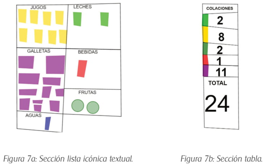 José produjo dos representaciones relacionadas (ver Anexo 3). Primeramente, construyó una lista del tipo icónica textual, esto es, íconos repetidos en celdas de una grilla para representar cada dato sin cardinal, utilizando palabras (registro textual) para rotular la categoría de la variable (Figura 7a). Luego, a partir de la primera representación construye la segunda, la que corresponde a una tabla con categorías de la variable representadas por rectángulos de color con sus respectivas frecuencias absolutas marginales y frecuencia total (Figura 7b). Su clasificación es exhaustiva porque representó las 24 colaciones. Sin embargo, la cantidad de categorías de la variable de la lista que corresponde a seis, no coincide numéricamente con las cinco categorías de la variable de la tabla que consideró en su construcción.