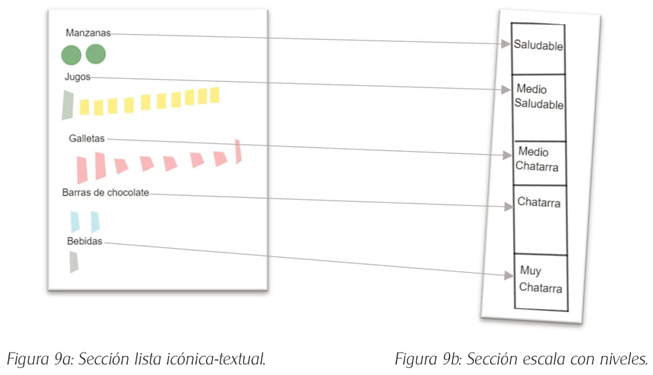 La génesis semiótica de Javier se activó al decodificar el representamen, mediante una visualización de los datos asociados a la variable “tipo de colación”, después codifica los datos en íconos referidos al tipo de colación (Figura 9a), en que activó una visualización de los datos asociados a la variable “calidad nutricional de la colación” con cinco niveles graduados (Figura 9b).