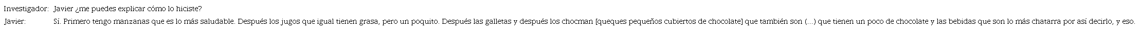 Javier al explicar su representación -lista con escala- evidencia que el orden de su lista estaba implícitamente graduado en niveles desde “lo más saludable” a “lo más chatarra” en sus palabras. La representación final de Javier muestra la variabilidad de los datos en la lista con la escala de cinco niveles.