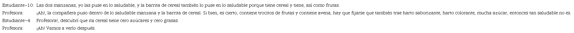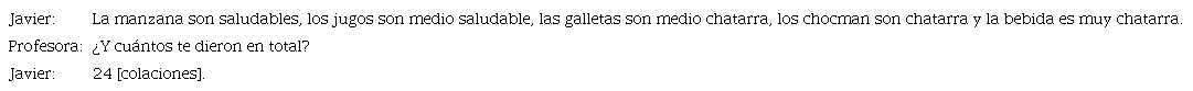 La conclusión al problema. Al término de la lección, algunos estudiantes explicaron sus representaciones de datos y contestaron ¿de qué manera podemos organizar nuestras colaciones para saber si son saludables? En la Conclusión (C), los estudiantes indicaron que la mayoría de las colaciones son “chatarras”, puesto que tenía un bajo valor nutricional. A continuación, se exhibe un extracto del término de la lección.