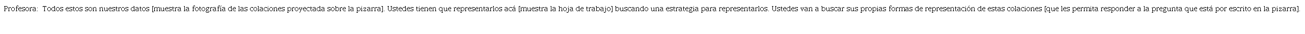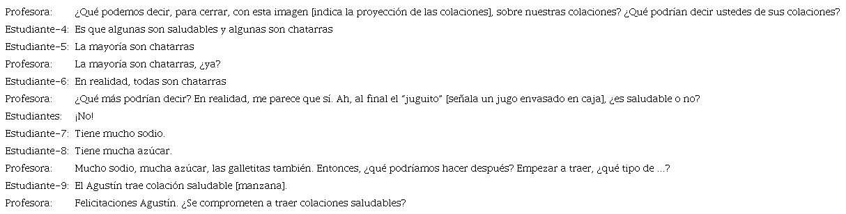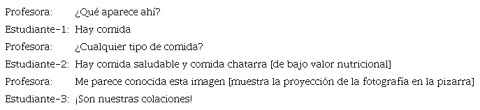 La necesidad de los datos. En la etapa de Datos (D), al inicio de la implementación de la lección, los estudiantes identificaron sus propias colaciones, a través de la proyección ampliada de dicha fotografía en aula. A continuación, un extracto de cómo la profesora despertó la necesidad de los datos en sus estudiantes.
