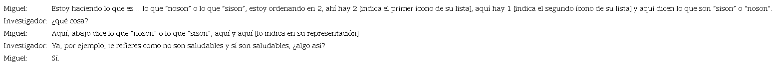 La génesis instrumental de Miguel fue activada al construir la lista -producto de la instrumentación que hace de los íconos dibujados para las 22 colaciones consideradas-, aunque dificulta responder la pregunta. En la lista, cada ícono con cardinal representa una categoría de la variable “tipo de colación” con su respectiva frecuencia, y luego rotula dichos íconos como “sison” o “noson”, que remiten a la categoría de la variable “calidad nutricional de la colación”.