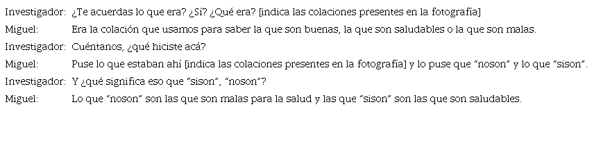 La génesis semiótica de Miguel se activó al decodificar el representamen de las colaciones de su hoja de trabajo, en que visualiza las colaciones como datos, según la variable “tipo de colación”. Luego, codifica en íconos que dibuja como categorías de la variable “tipo de colación” y después vuelve a decodificar, visualizando una segunda variable “calidad nutricional de la colación”, en que para cada categoría inicial vuelve a codificar con los rótulos “noson” y “sison”.