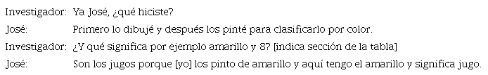 Cuando José pinta, no lo hace de manera azarosa, sino que establece una estrategia de clasificación en el que presenta para cada color una única categoría de la variable. Por ejemplo, indica que pinta de amarillo los íconos dibujados que remiten a jugos.