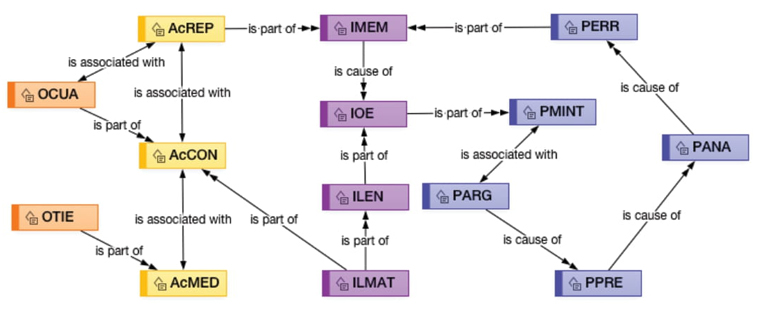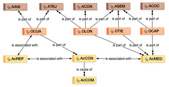 En la figura 2 se evidencian las relaciones entre las destrezas reflejadas a través de actividades cotidianas que poseen matemática implícita y la forma de explicitar estos elementos a través de objetos y acciones matemáticas emergentes. Así, desde las actividades que contienen objetos matemáticos como cuidar animales (AANI), tejer (ATEJ), construir (ACON), sembrar (ASEM) y cocinar (ACOC), se desprenden las acciones matemáticas involucradas como medir (AcMED), contar (AcCON), representar (AcREP) y comparar (AcCOM) en la manipulación conceptual de los objetos matemáticos de longitud (OLON), tiempo (OTIE), capacidad (OCAP), cuantificador (OCUA).