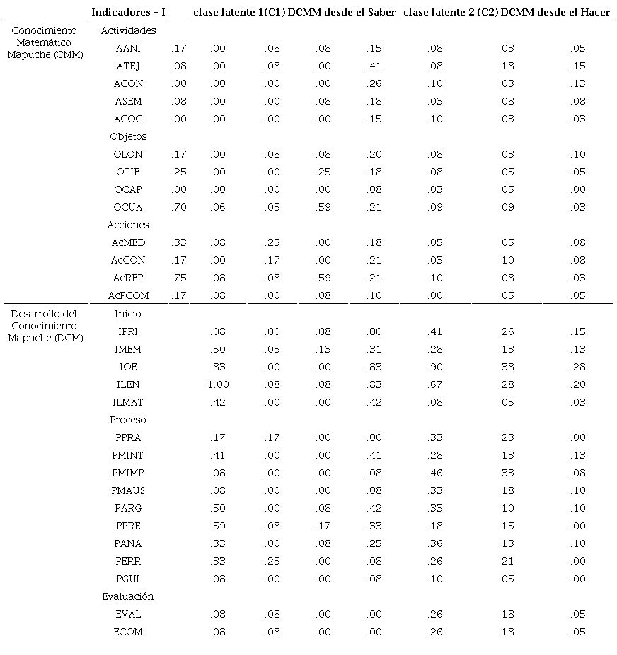 Por lo general, este grupo de personas ha desarrollado actividades cotidianas del pueblo en un periodo breve de su niñez basado en la práctica o los relatos de otros, en el contexto de la crianza con abuelas no escolarizadas y hablantes de mapudungun. Por ello, esta clase latente se ha denominado ‘Desarrollo de Conocimiento Matemático Mapuche (DCMM) desde el Saber’.