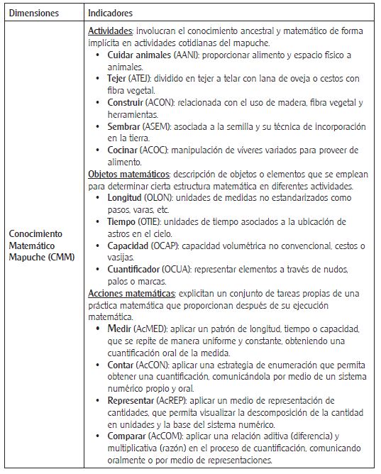 Desde el análisis de las entrevistas, el Desarrollo del Conocimiento Matemático Mapuche (DCMM) se descompone analíticamente en dos dimensiones, el Cono-cimiento Matemático Mapuche (CMM) y el Desarrollo del Conocimiento Mapuche (DCM), ambos caracterizados por indicadores que desagregan sus respectivos componentes conceptuales (ver tabla 1).