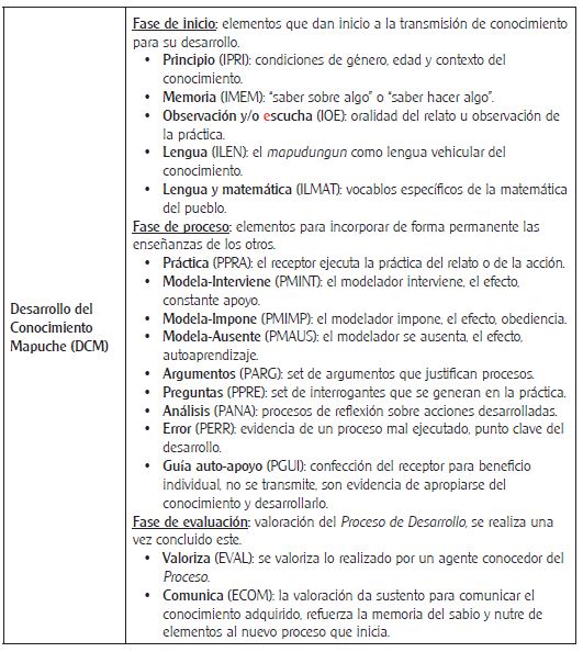Por otro lado, el DCM distingue tres marcos de indicadores centrados en el inicio, proceso y evaluación de la transmisión y desarrollo de conocimientos mapuche arraigado en las actividades cotidianas con matemática implícita, pero enfocado en las características y formas en que los actores involucrados des-pliegan su conocimiento e interactúan con el aprendiz. Este conjunto de indicadores desagrega y profundiza el indicador denominado “Formas de construcción de conocimiento” de Quilaqueo y San Martín (2008), como sus modos de transferencia y enseñanza (Del Pino y Ferrada, 2019; Luna et al., 2018), pero específicas hacia conceptos y objetos matemáticos propios del pueblo mapuche, al estar insertas en el “Saber” y en el “Hacer” de los sujetos entrevistados. Si bien se distinguen tres fases, estas están imbricadas en el desarrollo del CMM, tal como lo plantea Luna et al. (2018) cuando afirman que en los modelos de enseñanza del pueblo mapuche no es posible separar el método