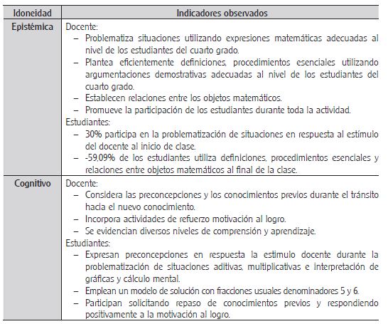 Lo anteriormente descrito producto del análisis y valoración de las observaciones realizadas, permite reconocer que el hecho de adquirir competencias en cuanto a la idoneidad didáctica a través de los módulos orientados al desarrollo de las capacidades matemáticas implementados en el cuarto grado de la Educación Básica, brindan al docente la posibilidad de reflexionar sobre su práctica didáctica, con el fin de que esta sirva para orientar futuras intervenciones y, en con-secuencia, mejorar su praxis.