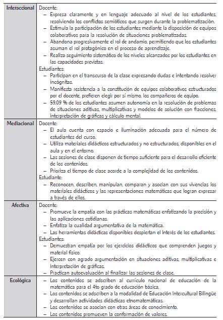 En consecuencia, se pudo observar que, durante el desempeño de actividades participativas planificadas dentro de los módulos de uso de materiales didácticos implementados para la enseñanza de la matemática en el cuarto grado, se logró identificar la presencia de los indicadores: idoneidad epistémica, interactiva-afectiva, e idoneidad mediacional. Indicadores que bien expresan las potencialidades de la matematización manipulativa, desarrollada mediante la aplicación de estrategias modulares colaborativas, donde el estudiante adquiere conocimientos mate-máticos a través de la experiencia con materiales didácticos estructurados y no estructurados, en interacción con el grupo y con el entorno.