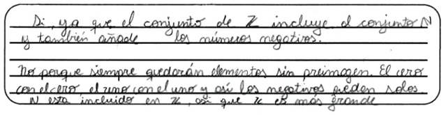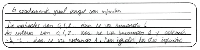 Una tercera mayoría, 35 estudiantes responden que el conjunto de los números enteros equivale al doble del conjunto de los números naturales (ver figura 10). Esta conclusión la obtienen al realizar acciones, los estudiantes iteran en un intervalo finito. Por ejemplo, un estudiante realiza la transformación del primer millón de números naturales, concluyendo que siempre quedarán elementos sin preimagen, en este caso exactamente 1 millón de elementos quedará sin preimagen, esta idea impide dar el paso al mecanismo de interiorización, y por tanto tampoco a alcanzar el proceso iterativo infinito.