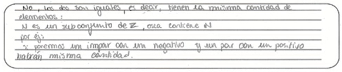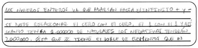 Asimismo, 38 de los estudiantes, aluden a la unicidad de infinito. En este sentido, el estudiante podría estar en la estructura proceso, entendiendo el proceso iterado para generar el conjunto de los números naturales y el proceso para generar los números enteros, o inclusive, podría estar en la estructura de totalidad, entendiendo la existencia del conjunto de los números naturales o de los números enteros como un todo, pero no existe una coordinación que le permita dar argumentos válidos para mostrar que los cardinales de los conjuntos son iguales, es decir, no se establecen las iteraciones respectivas para realizar la coordinación.