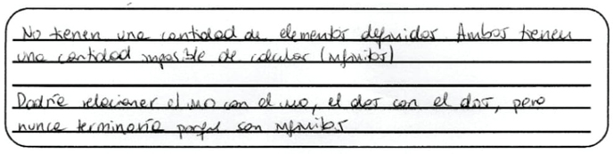 También, 11 respuestas de los estudiantes se conectan históricamente con los griegos ya que ellos niegan la utilidad del infinito matemático e inclusive de su existencia, esto puede interpretarse como con el infinito no se puede; con infinitos no comparo o no puedo comparar. Es decir, realizan la estructura de acción, pero se queda en el proceso iterativo infinito, de cada uno de los conjuntos y no logra verlo como un proceso terminado, para luego coordinar esos procesos y realizar la comparación (ver figura 11).