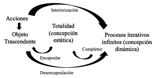 Asimismo, cuando hablamos de infinito debemos considerar que “las estructuras y mecanismos tradicionales no han sido suficientes para explicar la manera como los individuos intentan comprender situaciones matemáticas que involucran el infinito” (Roa-Fuentes y Oktaç, 2014, p. 74). Es así como el estudio infinito matemático en la Teoría APOE es de suma importancia, ya que han emanado nuevas estructuras y mecanismos mentales para poder explicar el proceso constructivo que implica este concepto. Específicamente, Dubinsky et al. (2013) plantearon una nueva estructura independiente, la cual se encuentra entre las estructuras de proceso y objeto; esta estructura permite que el estudiante pueda ver el proceso iterativo infinito como un todo terminado; a esta nueva estructura la denominaron Totality, que aquí se llamará totalidad.