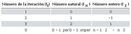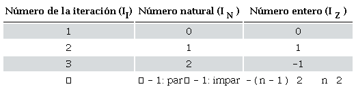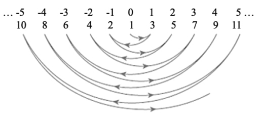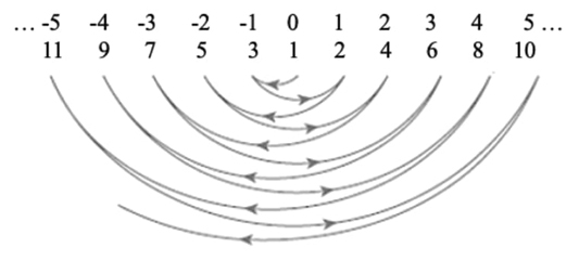 Las iteraciones presentadas muestran que el conjunto de los números enteros es un conjunto numerable, es decir, que los números enteros son contables por medio de los números naturales. A continuación, se muestra cómo es el conteo de la primera iteración y luego el de la segunda (ver figuras 4 y 5):