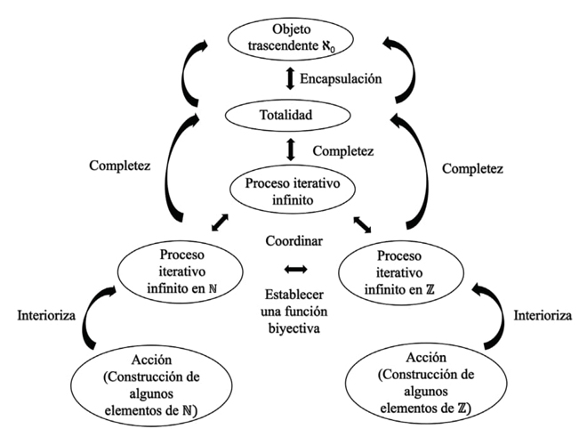 En relación a las estructuras y mecanismos mentales, el estudiante se encontrará en una estructura acción si es capaz de establecer una iteración para una cantidad pequeña de elementos, asociando a cada número natural un único número entero. Si se toman como base las acciones, y se coordinan, entonces el individuo ha interiorizado las acciones en un único proceso iterativo infinito I, desde una concepción dinámica. La coordinación será posible mediante una relación biyectiva. Cabe mencionar que cada uno de los procesos iterativos infinitos II, IN, IZ, son a su vez iteraciones. El mecanismo que permitirá al individuo ver al proceso como un todo terminado, es decir, como una estructura totalidad, será el mecanismo completez. Alcanzar la estructura totalidad dependerá de ver al menos a uno de los procesos iterativos infinitos II, IN, IZ, como un todo terminado. Posteriormente, mediante el mecanismo de encapsulación, los estudiantes podrían alcanzar el objeto trascendente ℵ0 (Aleph cero), correspondiente al cardinal de los conjuntos numerables.