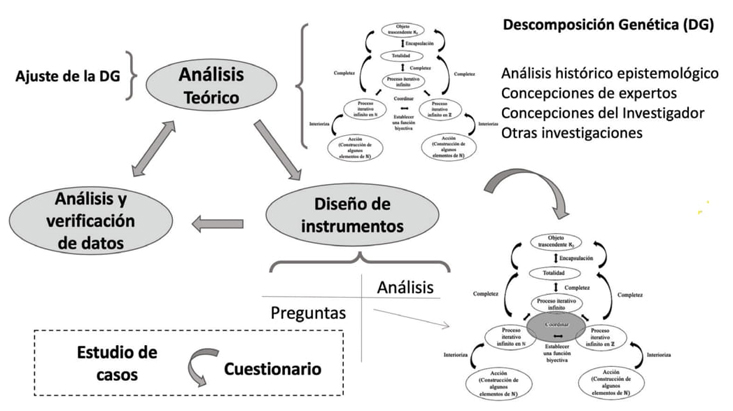 El método utilizado es una adaptación del ciclo de investigación propuesto por la Teoría APOE, donde se busca describir e interpretar cómo un estudiante logra ciertos estados de construcción mental sobre el concepto de infinito actual. Este ciclo propone el desarrollo de tres componentes, (I) un análisis teórico, del cual se desprende una descomposición genética preliminar; (II) un diseño e implementación de un modelo de enseñanza; (III) observación, análisis y verificación de datos a partir de los cuales se reestructura y valida el análisis teórico inicial (Asiala et al., 1996). La aplicación de este ciclo permite obtener una descripción detallada y cercana a la construcción cognitiva de los conceptos mate-máticos. Cada vez que es aplicado con base en la descomposición genética de un concepto, esta se refina como resultado del análisis sobre los datos empíricos que se obtuvieron en el desarrollo de la tercera componente.