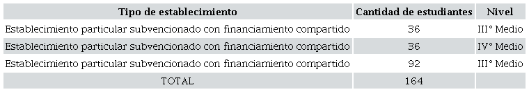 Caso A: Compuesto por 72 estudiantes de tercero y cuarto año medio de un colegio de dependencia particular subvencionado de la región metropolitana, ubicado en la comuna de La Granja. Es un grupo mixto entre mujeres y hombres, cuyas edades fluctúan entre 15 y 18 años.