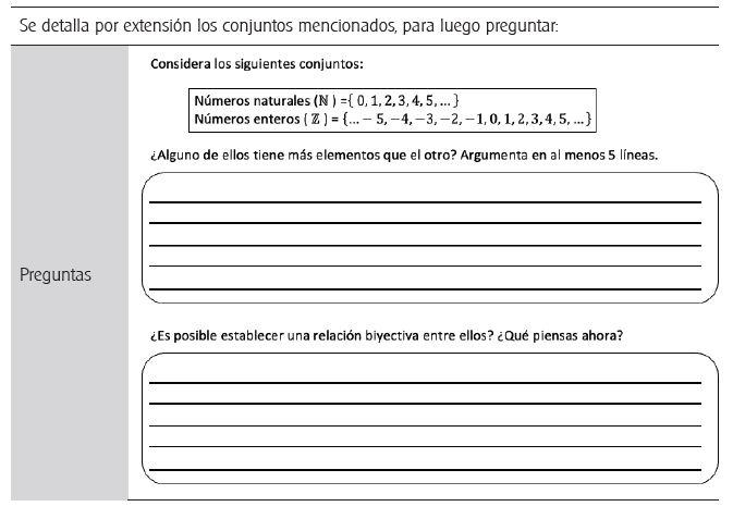 Montoro, V., Scheuer, N., y Pérez, M. (2016). ¿Cuán abundantes son los conjuntos de números? Estudiantes comparando infinitos. Educación Matemática, 28(3), 145-174.