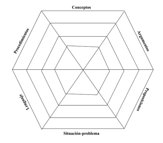 Objetos referidos en las prácticas. Se muestra la trama de objetos primarios (conceptos, lenguajes, procedimientos, proposiciones y argumentos) identificados en cada una de las prácticas matemáticas.