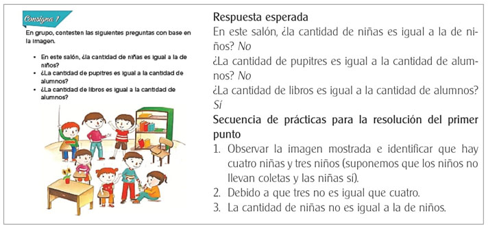 En la figura 3, se muestra el análisis de una tarea en el contexto cardinal, en la que se pide contestar tres preguntas, sobre la cantidad de objetos en un salón de clases. En este caso, antes de presentar la secuencia de prácticas, se muestra la respuesta esperada a las preguntas planteadas en la tarea. Mientras que, en la secuencia de prácticas se muestran los pasos que el estudiante seguiría para llegar a la respuesta esperada.