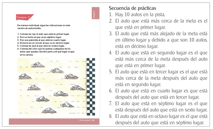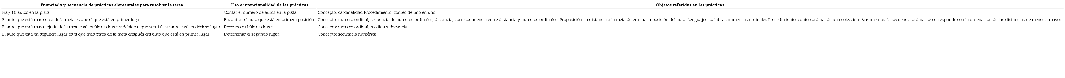 En la figura 4, se presenta el análisis de una tarea en contexto ordinal, donde se pretende identificar la posición que le corresponde a cada coche, tomando como referencia su distancia a la meta. En ella intervienen distintos objetos primarios, como las palabras numéricas ordinales, la secuencia en la que se recitan las palabras numéricas, entre otras.