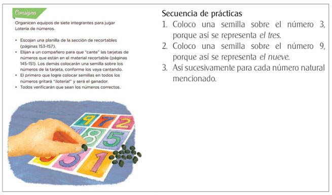 Por ejemplo, para el significado de secuencia numérica, y particularmente sobre la introducción de los números naturales en los distintos grados escolares. En primer grado, se concentró la mayor cantidad de tareas (17 tareas), donde se aborda la expresión verbal, escrita y el orden de los números del 0 al 99, utilizando herramientas como la tabla-100, canciones infantiles, fichas, entre otras. En segundo grado, esta cantidad disminuye a cinco tareas, donde se contempla la expresión verbal, escrita y el orden de los números del 100 al 999. En tercer grado, ya no es presentada explícitamente, la secuencia numérica del 1000 al 10,000, pero si se utilizan números de cuatro cifras en la resolución de problemas.