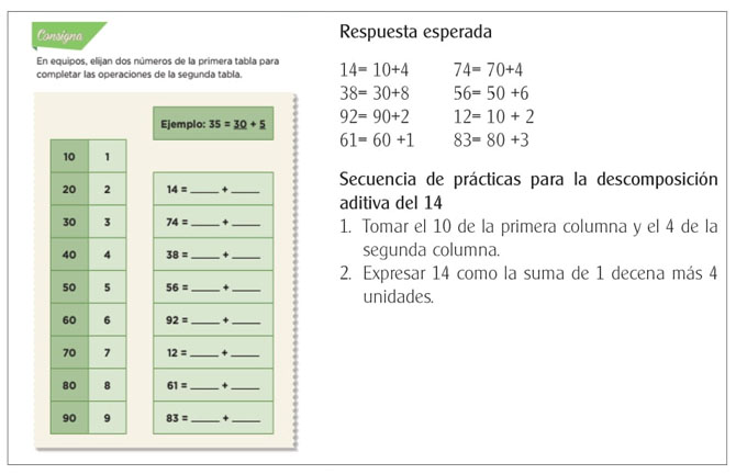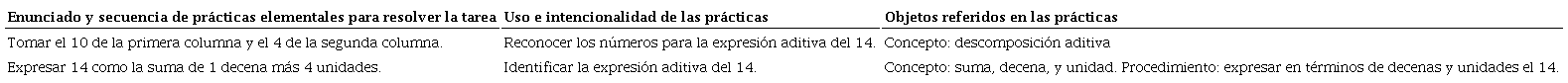 Finalmente, en la configuración epistémica del número natural en su significado operacional, el libro de texto presenta una tarea donde se tiene como lenguaje la descomposición aditiva de números naturales de dos cifras en términos de unidades y decenas. Por otra parte, se presenta como procedimiento la descomposición aditiva, como argumento el valor posicional de las cifras de un número. Y finalmente como proposiciones la descomposición aditiva del 14 como 10 + 4.