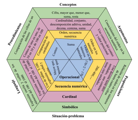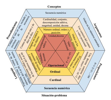 Por otra parte, en la configuración epistémica del número natural como cardinal, se identificaron tareas relacionadas con el conteo de colecciones de objetos (frijolitos, dinero, naranjas, etc.), así como tareas que abordan el valor posicional de números de dos cifras. En ese sentido, en el apartado de lenguaje se tratan aspectos como la expresión verbal y escrita de números del 0 al 99, así como el uso de fichas de colores para el trabajo con el valor posicional. Mientras que, el procedimiento que predomina en la resolución de las tareas, es el conteo de uno en uno y de diez en diez. Respecto a los conceptos se nota la emergencia del concepto cardinalidad, conjunto, descomposición aditiva, magnitud, unidad, decena. Ahora, para el caso de los argumentos existen dos predominantes, aquellos relacionados con el valor posicional de números de dos cifras, y realizar correctamente el conteo de una colección de objetos. Finalmente, en el caso de las proposiciones, estas se relacionan con la conversión entre la expresión verbal y la escrita, por ejemplo, trece se representa como 13, así como el valor posicional, es decir, una decena está conformada por diez unidades.