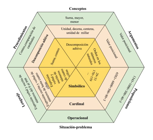 Por otra parte, la configuración epistémica del significado cardinal del número natural, las tareas propuestas para el tratamiento de este significado, están enfocadas específicamente en el valor posicional para números de hasta cuatro cifras. En ese sentido, en el lenguaje se trabaja con la expresión verbal y escrita de números de hasta cuatro cifras, como procedimiento para lo anterior está la descomposición aditiva, mientras que los conceptos son unidades de millar, centenas, decenas y unidades, aunado a lo anterior como argumentos se tiene el valor posicional, y las proposiciones están relacionadas a la descomposición aditiva de algunos números de cuatro cifras, por ejemplo, 6583=6000+500+80+3.