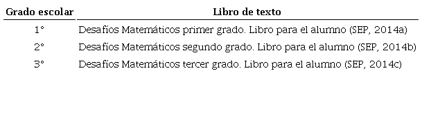 El trabajo de investigación es de tipo cualitativo, de nivel descriptivo y se centra en el análisis de los libros de texto Desafíos matemáticos, que de acuerdo con la SEP (2011a) eran utilizados en el segundo periodo escolar, es decir, 1°, 2° y 3° de la Educación Primaria en México. En la tabla 1, se presenta información sobre los textos analizados.