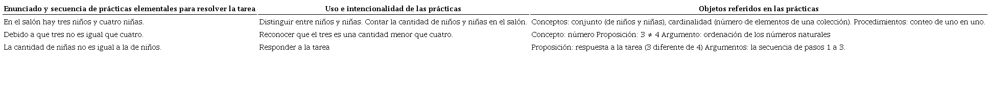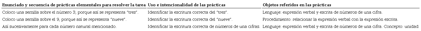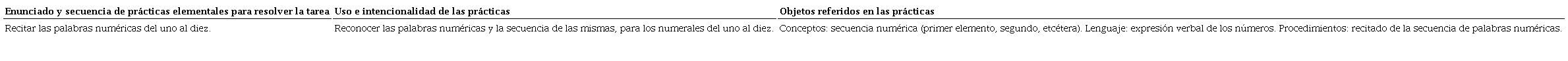 En el lado izquierdo se muestra la tarea analizada, mientras que del lado derecho se presenta la secuencia de prácticas (operativas y discursivas) esperadas para la ejecución de la misma. La tarea presenta las palabras numéricas del uno al diez, y el orden en que se recitan las mismas. La secuencia de prácticas está enfocada en el recitado de las palabras numéricas del uno al diez. Por tal motivo, en el análisis ontosemiótico se analizan prácticas cuyos objetos primarios intervinientes son: la secuencia numérica (concepto), la expresión verbal (lenguaje), y el recitado de la secuencia numérica (procedimiento). El análisis de las prácticas se puede ver en la tabla 3.