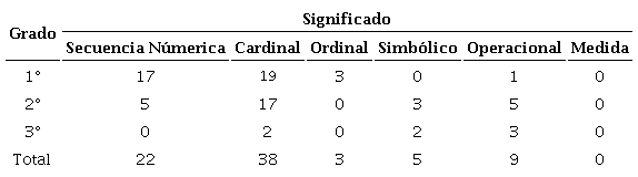 Por otra parte, el significado ordinal solo es abordado en primer grado, don-de muestran la expresión verbal, escrita y el orden de los primeros 10 números ordinales. El significado simbólico es tratado en segundo y tercer grado con cinco tareas en total, donde se utilizan números de dos y tres cifras en tarjetas.