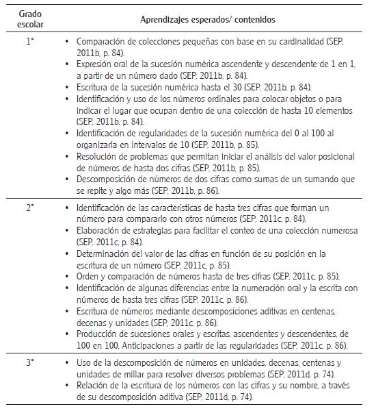 De acuerdo con los Programas de Estudio 2011 (SEP, 2011b, 2011c; 2011d) para el eje sentido numérico y pensamiento algebraico se tiene como objetivo que “el alumno lee, escribe y compara números naturales de hasta cuatro cifras” (SEP, 2011b p. 72). El eje está organizado en ocho temas, y para esta investigación se analiza lo referido al tema “números y sistemas de numeración” así como los contenidos y tareas propuestas para el tratamiento del mismo, en los tres grados escolares. En la tabla 2, se muestran los aprendizajes esperados para el tratamiento del número natural en cada grado escolar.