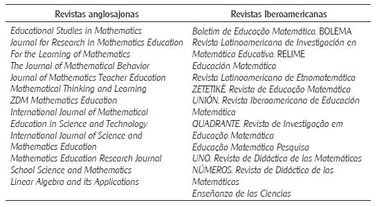 Para identificar los artículos de investigación que de manera específica abordaran el tema de espacio vectorial, buscamos ya sea en el título, resumen, o palabras clave, el término “espacio vectorial” o su traducción al inglés (vector space) o al portugués (espaç̧o vetorial). Cuando era posible, esta búsqueda se realizaba utilizando el buscador de cada revista; si este buscador no estaba disponible entonces se realizaba la búsqueda de manera manual, artículo por artículo. Esto nos permitió discriminar trabajos que, aunque abordaran conceptos relacionados con los espacios vectoriales (bases, combinaciones lineales, dependencia e independencia lineal, etc.), no tenían como interés principal dicho concepto.
