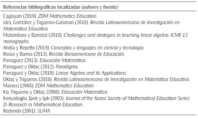 Sobre las fuentes consultadas, nuestra revisión de literatura se centró únicamente en artículos publicados en revistas de investigación y, en libros o capítulos de libro especializados publicados en editoriales de prestigio. Estamos conscientes de que puede haber literatura relacionada con el concepto de espacio vectorial que ha sido publicada en memorias de congreso o en trabajos de tesis; sin embargo, decidimos centrarnos en revistas de investigación y capítulos de libro especializados para tratar de asegurar que las investigaciones en las que se basa nuestra revisión hayan sido sometidas a un proceso riguroso de evaluación por pares. Esta selectividad en las fuentes de información dota de confiabilidad a los resultados de esta revisión.