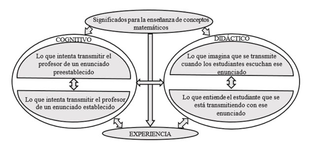 proponen un enfoque holístico para el estudio de los significados para la enseñanza a partir de lo que el profesor intenta transmitir, lo que imagina que se transmite y lo que el interlocutor (estudiante) concibe que se está transmitiendo. Estos investigadores han centrado sus estudios, esencialmente, en los dos primeros elementos de la terna antes mencionada; en esta dirección, para valorar los significados para la enseñanza integramos al estudio el tercer elemento, el interlocutor (estudiante).
