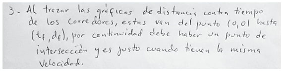 El estudio piloto corroboró los altos niveles de complejidad que entraña el estudio de los significados del concepto de pendiente. Principalmente, se observan dificultades relacionadas con el significado que los docentes le asocian a algunas de las exigencias planteadas en los instrumentos; lo que revela un análisis descontextualizado de las situaciones problémicas presentadas. Los profesores manifiestan un conflicto cognitivo, en cuanto al significado de la pendiente bajo un cambio de escala del sistema de coordenadas. También se presenta confusión entre los aspectos funcionales y los aspectos asociados a la razón de cambio instantánea, significado analítico de la pendiente. A título de ejemplo, cabe mencionar que el 40% de los profesores participantes en la prueba piloto asumió en su respuesta al tercer problema del cuestionario que, si los corredores ocupaban la misma posición en algún momento, entonces tendrían la misma velocidad. He aquí la respuesta del profesor P7: