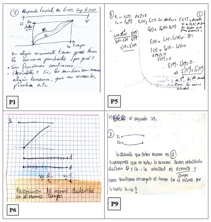 Las dificultades son típicas: modelación aproximada del problema y descripción del razonamiento en forma incompleta (P1), desarrollo de un esquema analítico con descuido de los procesos de límite que acompañan al cociente incremental (P5), respuesta trivial por ausencia de comprensión plena del problema (P6), y confusión de los conceptos de velocidad instantánea y de velocidad media (P9). Todas las respuestas se digitalizaron con el objetivo de que los expertos contaran con un complemento de aplicación preliminar del conjunto de instrumentos elaborados.
