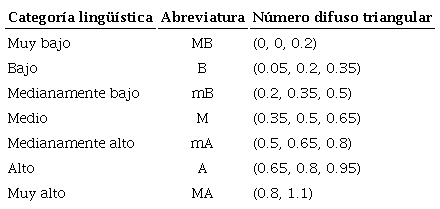 Ya que la información que proviene del conocimiento experto es flexible y subjetiva, se utiliza un enfoque borroso para el procesamiento de datos con la técnica antes mencionada (Park et al., 2011). Además, cada categoría evaluativa tiene forma de variable lingüística, razón por la cual se “fuzzifica” con ayuda de una correspondencia biunívoca propuesta por Wang y Lee (2009), la cual se ilustra en la tabla 1.